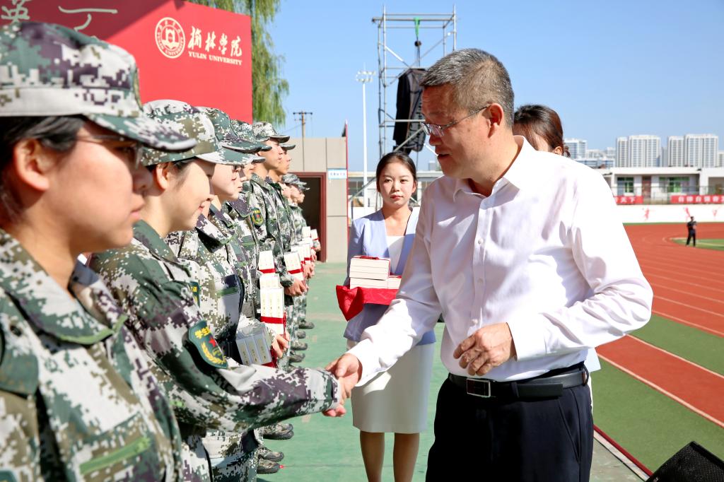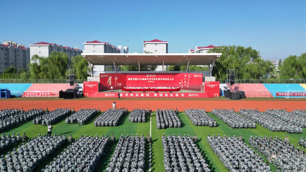 秋风启序幕,奋斗铸华章。9月1日,我校在田径场隆重举行2025级本科新生开学典礼暨军训动员大会。党委书记张新柱向军训团授旗,党委副书记、校长康伟致迎新辞并为新生代表赠送《平凡的世界》和佩戴校徽,副校长姚学慧主持;党委副书记闫龙、马亚军,副校长卜耀军,全国模范教师、优秀援藏教师、陕西省师德标兵、我校1992级优秀校友高鱼仓,武警榆林支队中校、副支队长谢庆,武警榆林支队执勤一大队大队长、榆林学院军训团团长张家超,各学院院长、党总支书记,相关职能部门负责人在主席台就坐。2025级新生辅导员、班主任,2025级全体本科生,承担军训任务的全体教官近4000人参加。
