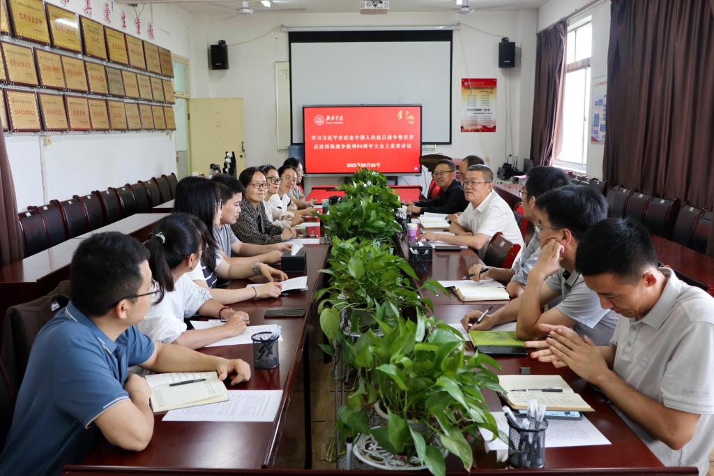 会上传达学习了习近平总书记在纪念中国人民抗日战争暨世界反法西斯战争胜利80周年大会上的重要讲话。座谈讨论中大家纷纷表示,聆听习近平总书记的重要讲话,观摩盛大阅兵式,广大师生心潮澎湃、振奋昂扬,中国人民抗日战争的伟大胜利,矗立起伟大抗战精神的丰碑,坚定了中华儿女正义必胜、和平必胜、人民必胜的信念;新时代的伟大成就,更加坚定了中国人民走自己的路的必胜信念,中华民族伟大复兴进入了不可逆转的历史进程,大家要全面学习贯彻习近平新时代中国特色社会主义思想,珍惜当下难得的和平发展机遇,勇挑重担,为学校的高质量发展和中华民族伟大复兴贡献力量。