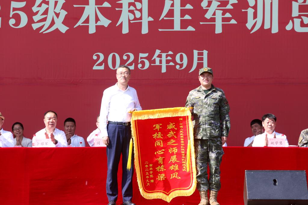 姚学慧代表学校向全体承训教官致以崇高敬意和衷心感谢,并向顺利完成军训的全体同学表示热烈祝贺。他指出,在14天的军训中,同学们身着戎装、斗志昂扬,迎朝阳、披星光,用汗水书写青春,圆满完成了大学“第一课”。这是一堂锻造之课、扎根之课,更是启航之课,大家铸就了令行禁止的纪律意识、团结协作的集体观念,厚植了家国情怀与红色基因,坚定了自我挑战的勇气和勇于担当的责任。这段经历将成为同学们大学生活乃至人生征程中宝贵的精神财富。他向同学们提出三点希望:一要对标军人标准,赓续红色血脉,将忠诚信念、纪律观念和集体意识融入日常,以李子洲等先辈为榜样,从学校红色传统中汲取力量,胸怀“国之大者”,坚守理想、严守纪律、勤奋求知、勇于突破,努力成为有理想、敢担当、能吃苦、肯奋斗的新时代青年;二要对标社会需求,锤炼过硬本领,将“迎难而上、敢打硬仗”的作风融入学习创新,在人工智能时代读好“有字之书”,努力成为专业基础厚、智能素养高、创新能力强的复合型人才;三要对标“五乐”育人,实现全面发展,积极践行“五乐”育人理念,在乐读中积淀智慧、乐讲中树立自信、乐跑中强健体魄、乐唱中陶冶情操、乐劳中创造价值,以实干成就自我,以奋斗点亮青春,做挺膺担当的时代新人。