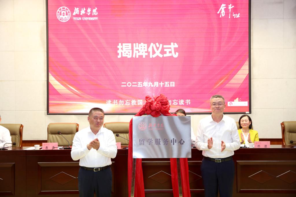 西安外国语大学党委书记刘振涛和榆林学院党委副书记、校长康伟共同为“榆林学院留学服务中心”揭牌。