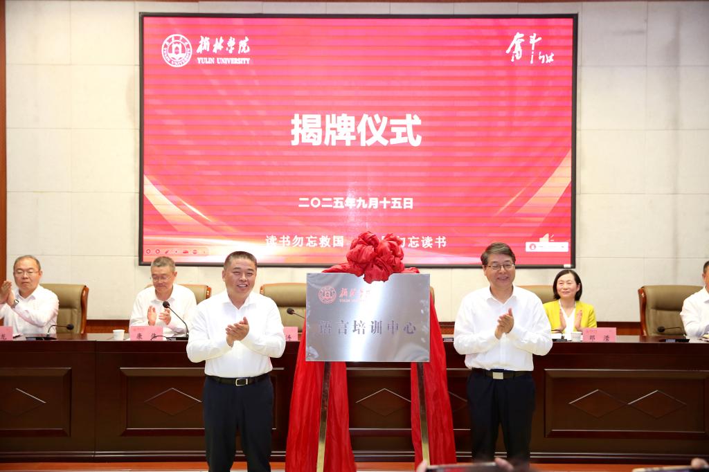 西安外国语大学党委书记刘振涛和榆林学院党委书记张新柱共同为“榆林学院语言培训中心”揭牌。