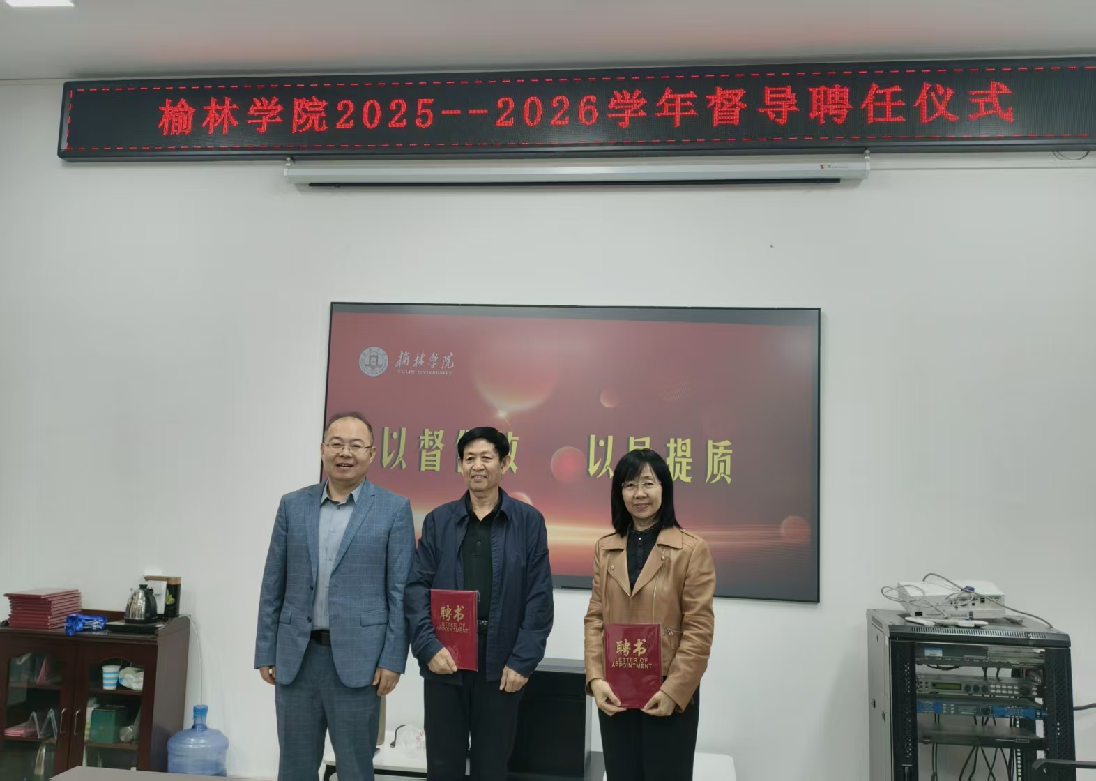 9月26日,我校在六号教学楼一楼会议室举行2025--2026学年教学督导聘任仪式。党委副书记闫龙出席并讲话,校督导团成员、二级学院教学副院长、质评办全体人员参加。