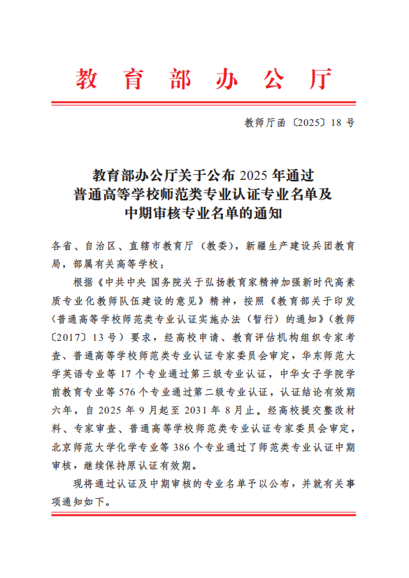 近日,教育部办公厅正式发布了《关于公布2025年通过普通高等学校师范类专业认证专业名单及中期审核专业名单的通知》(教师厅函〔2025〕18号),我校英语和学前教育两个专业顺利通过师范类专业第二级认证,生物科学专业也成功通过中期审核。
