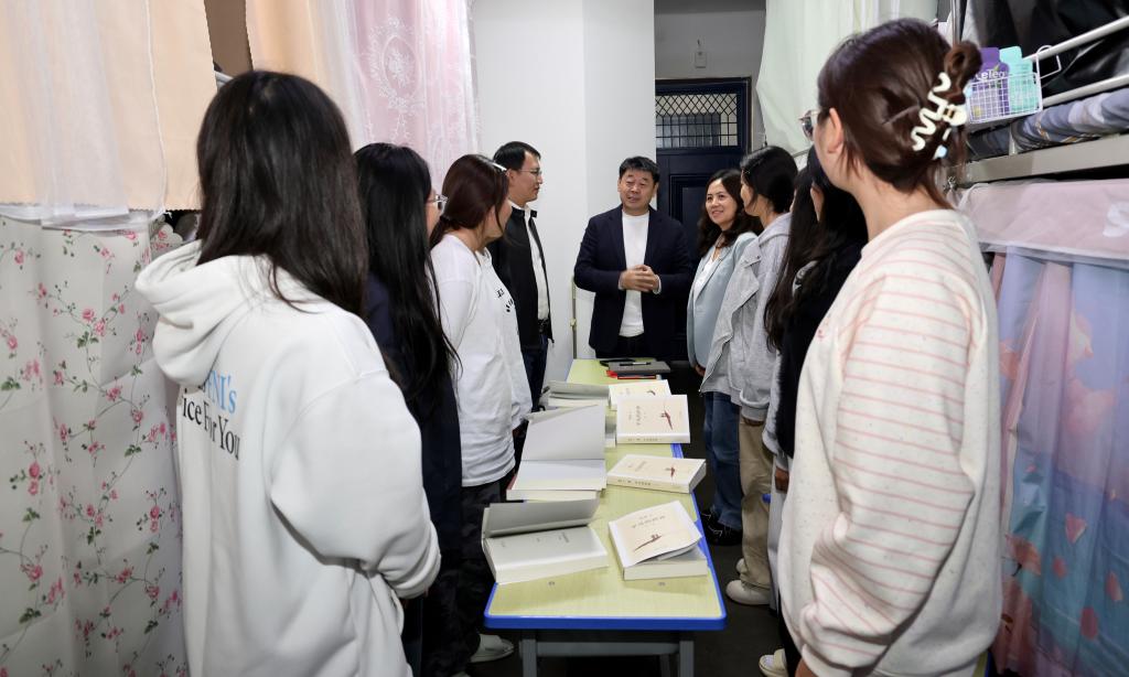 姚学慧首先亲切询问了同学们的学习、生活、阅读与思想状况,认真倾听大家在学习规划、宿舍环境、心理适应等方面的意见与建议。他强调,教师走进宿舍、与学生零距离交流,是落实立德树人根本任务的重要途径,更是将思想政治教育、服务保障与人文关怀融入日常生活的生动实践。同时,外国语学院党总支负责人从专业学习、人际沟通、时间管理等方面为同学们提出了中肯建议,鼓励大家主动适应大学生活,积极规划未来方向,在学习与生活中不断提升综合素质,实现全面发展。