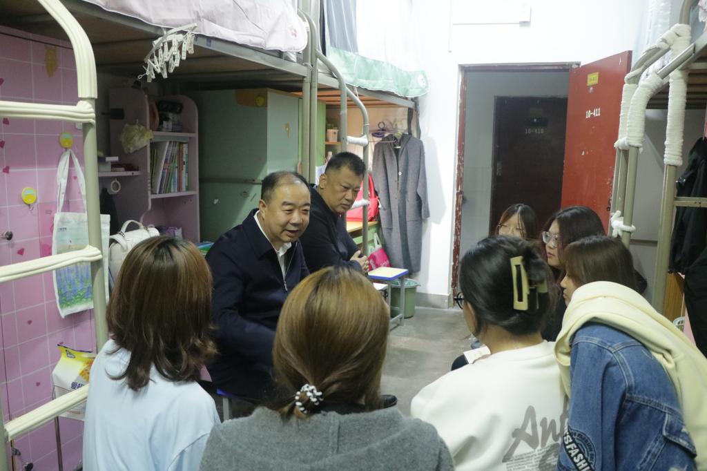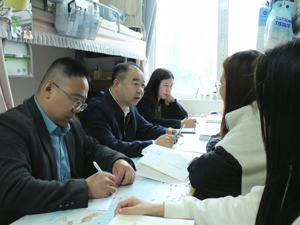 在数学与统计学院10号楼411宿舍,卜耀军与新生深入交流。他鼓励同学们要善用学校资源,积极参与"五乐"育人实践活动,实现从"被动接受"到"主动成长"的转变,在知行合一中提升综合素养。