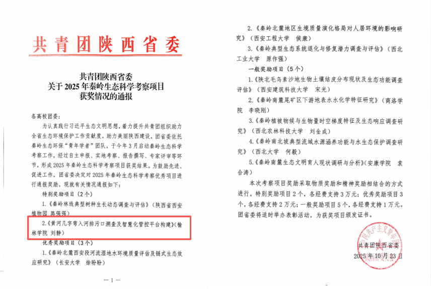 近日,共青团陕西省委正式公布2025年秦岭生态科学考察项目获奖结果,我校刘静博士主持的《黄河几字弯入河排污口溯查及智慧化管控平台构建》项目,凭借扎实的科研功底、深入的实地调研与高质量的考察报告,从众多申报项目中脱颖而出,荣获特别奖励项目,充分彰显了我校在生态环境保护领域的科研实力与人才培养成效。