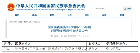 近日,我校文学院杨淇博士申报的“和合共生:‘三江并流’腹地燕门乡的民族志研究”,成功获批2025年度国家民委民族研究项目后期资助课题。杨淇博士为我校2023年引进博士,本次申报是其入职后相关研究领域的又一重要突破,充分体现了我校在高层次人才引进与培育方面取得的扎实成效,也是学校全面落实“人才强校”战略,学院青年人才培养体系取得实质性进展的生动例证。