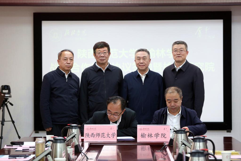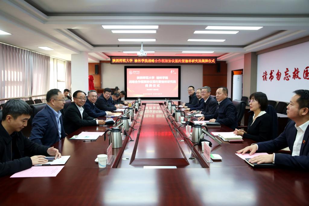 11月25日,陕西师范大学与我校战略合作框架协议签约暨榆林研究院揭牌仪式在行政楼四楼会议室隆重举行。陕西师范大学党委书记李晓兵,党委副书记、校长游旭群,副校长董治宝;我校党委书记康伟,党委副书记、校长付峰,副校长卜耀军出席,活动由付峰主持。