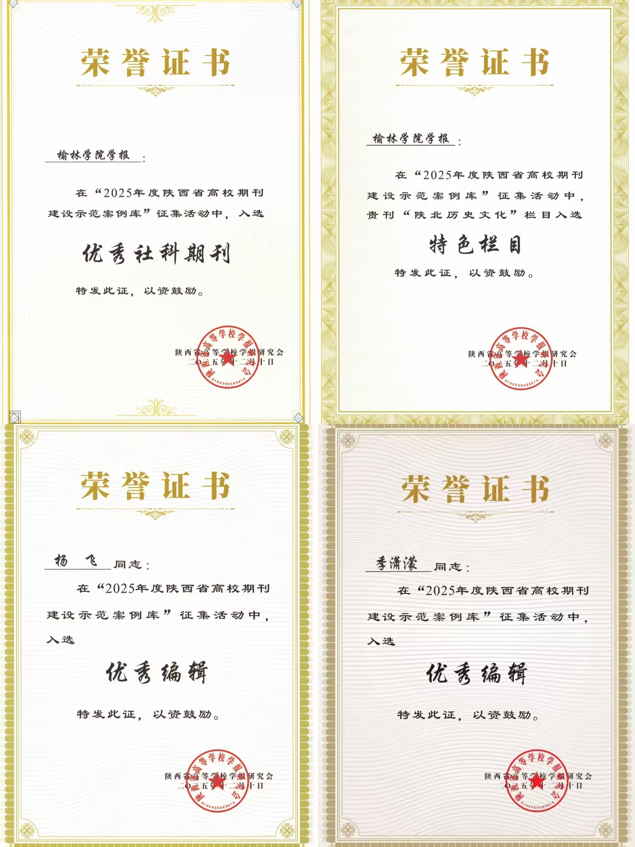 2025年12月10日至12日,陕西省高等学校学报研究会理事会议暨2025年秋季学术年会在陕西杨凌召开。会议公布了陕西省高校期刊建设及编辑培育优秀案例评选结果,《榆林学院学报》入选“2025年度陕西省高校期刊建设示范案例库•社科期刊案例•优秀期刊”;“陕北历史文化研究”专栏获评“2025年度陕西省高校期刊建设示范案例库•社科期刊•特色栏目”;编辑杨飞、季潇濛获“优秀编辑”称号。