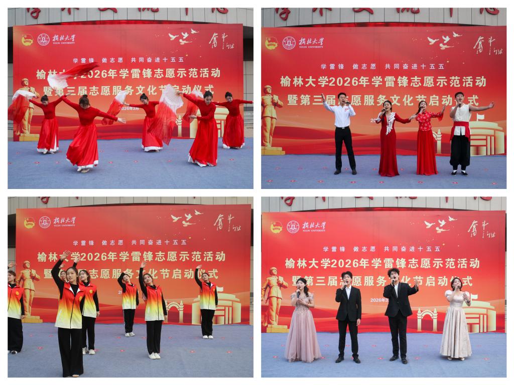 活动现场气氛热烈,文艺展演精彩纷呈。舞蹈《领航》翩跹灵动,尽展青年学子昂扬向上的青春风采;歌曲《有我》铿锵嘹亮,唱响新时代青年的使命担当与赤诚初心;朗诵《雷锋薪火,榆大青春》深情激昂,诉说雷锋精神的代代相传,字字铿锵、直抵人心;《灯火里的中国》温婉悠扬,用动人旋律抒发家国情怀,温暖全场;礼仪展示端庄雅致、举止从容,彰显榆大学子良好素养与文明风范;陕北民歌合唱高亢质朴,饱含黄土风情与红色底蕴,韵味悠长;舞蹈《奉献》轻柔唯美,以曼妙舞姿诠释志愿精神,传递温暖力量。歌声与舞姿交融,深情与热血共振,绘就出一幅青春激昂的志愿画卷。